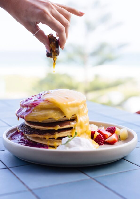 A golden pancake stack, pavlova, passionfruit, strawberries, blueberries, kiwi, chantilly cream.